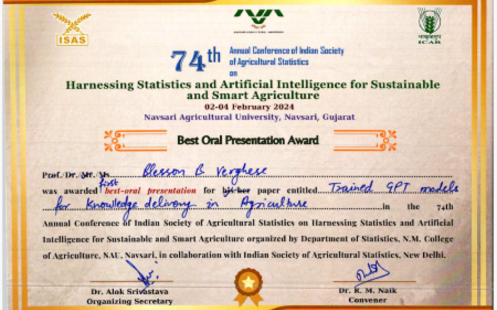 Blesson B. Varghese presented the paper, titled "Trained GPT Models for Knowledge Delivery in Agriculture," which captured the attention of the conference.  His research, which delves into the innovative use of trained Generative Pre-trained Transformer (GPT) models in agriculture, stood out among numerous high-caliber presentations.  Arunima Babu C.S. on the other hand, secured second prize under the theme 'Modern Statistical Designs and Tools for Effective Experimentation.