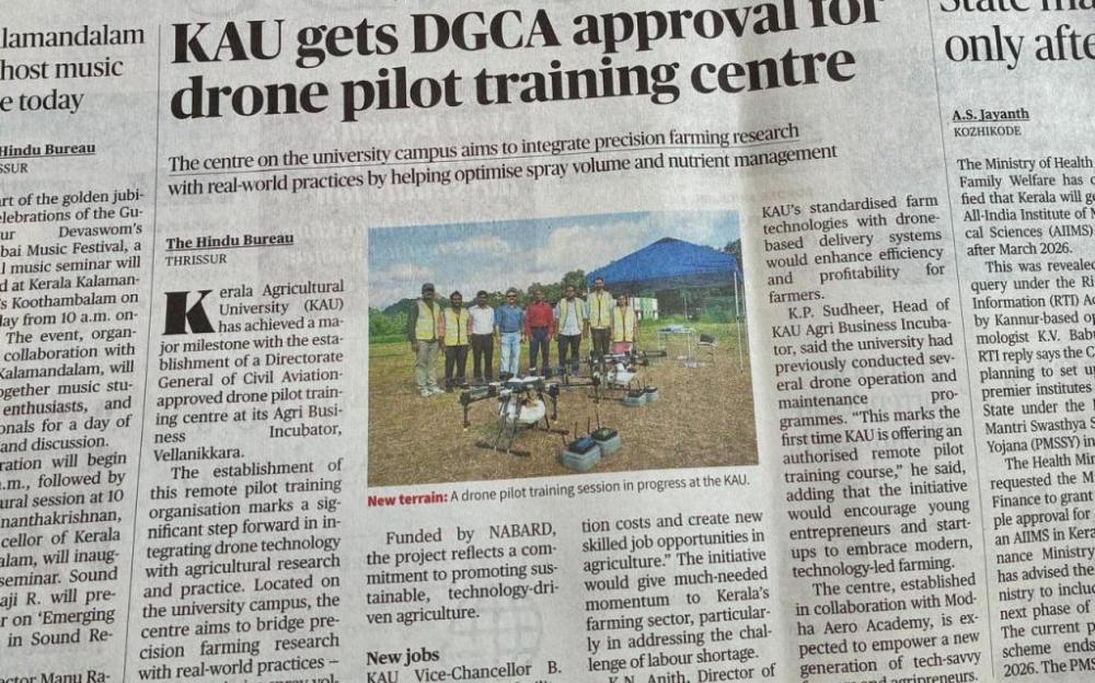 KAU has received DGCA approval for a Remote Pilot Training Organisation (RPTO) at KAU-RABI, Vellanikkara — an initiative integrating drone technology with agricultural research and practice. The centre, funded by NABARD and established with Modha Aero Academy, will empower farmers, startups, and agri-entrepreneurs with precision farming skills and drone-based solutions for sustainable agriculture